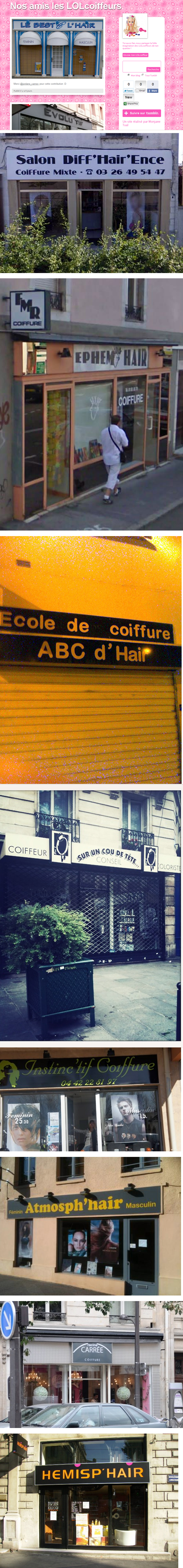 Pour finir, le WTF de cette semaine est placé sous le signe de la capillarité, de la racine, du peigne et des ciseaux.. vous l’aurez compris, on va s’intéresser aux devantures de nos chers coiffeurs français. Et oui, ils ont souvent l’humour fin (comm un cheveu) pour trouver des noms incroyablement originaux. Bref, un site a enfin été ouvert pour leur rendre hommage, ce site s’appelle Nos amis les LOLCoiffeurs :-)