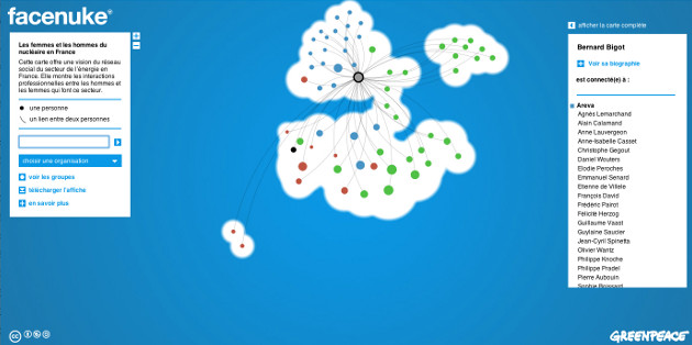 Basé sur un outil de visualisation, l’application de Greenpeace bute cependant quand il s’agit de retirer le directeur du CEA du listing. Sans Bernard Bigot, Facenuke, qui est censé reproduire les liens qui unissent les acteurs de la filière, n’est plus que l’ombre du réseau qu’il souhaite retracer. Le 18 octobre, le site est fermé. Mais des questions demeurent.