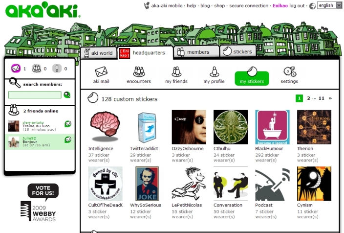 - Aka-aki est affinitaire : le principe des stickers est bien vu. Il s’agit de formes rectangulaires aux bords arrondis portant un nom, comprenant une image et éventuellement une description ou un lien. Chacun peut adopter ou créer des stickers puis les coller dans différentes cases de son profil en fonction de ce qu’ils représentent : qui je suis, ce que je fais pour vivre, ce que j’écoute, où je suis le jour, où je suis la nuit, ce que je regarde, ce qui me manque… Le mélange des deux peut d’ailleurs créer des différences : on peut par exemple être occupé par le cinéma et aimer regarder des photos d’art. J’ai créé une petite centaine de stickers, certains ont été adoptés par de nombreux membres : voilà qui facilite les rencontres et mises en contact affinitaires.