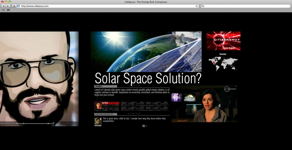 À l’origine, Collapsus était un documentaire pour la télévision néerlandaise VPRO, sur la transition à venir des combustibles fossiles à des sources d’énergie alternatives. Les producteurs voulaient attirer un public plus jeune, avec les mêmes idées et les mêmes thèmes. Ils ont demandé à Submarine Channel de plancher sur quelque chose de neuf et d’expérimental. Un méta-scénario a alors été conçu, sur la base des travaux pour le film. Puis un script interactif a été écrit, comprenant aussi bien le récit fictif que les mécanismes interactifs. On a ensuite mis tout ça ensemble, et on a divisé le travail en équipe : fiction, documentaire, interactivité.